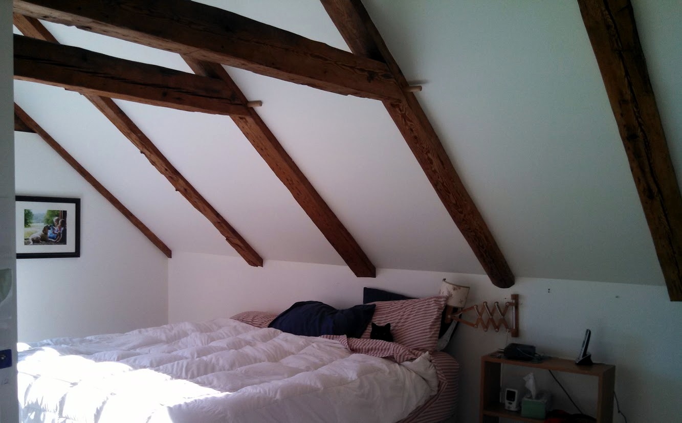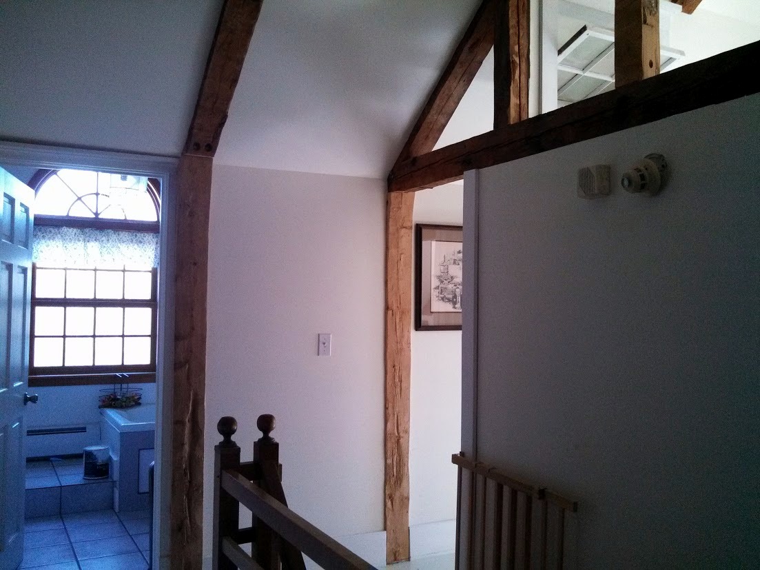 Upstairs, the house now has two guest bedrooms in addition to a master bedroom. As part of the work upstairs, the timber frame of the house was exposed, revealing some charred beams. This leads to conjecture of a possible fire in the house’s past. If only the walls could talk!